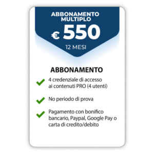 - ABBONAMENTO MULTIPLO, fino a 4 credenziali (4 utenti) – pagamento tramite bonifico bancario, PayPal, Google Pay o carta di credito/debito (senza periodo di prova gratuito).