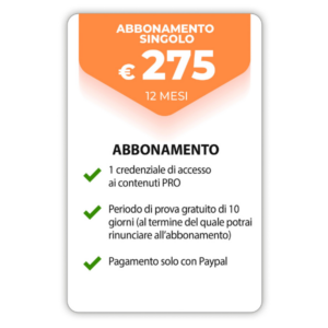 - ABBONAMENTO SINGOLO, 1 credenziale – pagamento tramite bonifico bancario, PayPal, Google Pay o carta di credito/debito (senza periodo di prova gratuito).